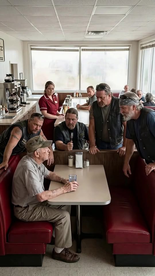 Tessa looked up first. Then the truck driver near the entrance. Then the young couple by the window. One by one, everyone turned toward the parking lot as five large motorcycles rolled in and parked side by side under the pale morning light.