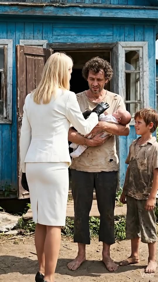 His shirt was worn. His eyes were hollow with exhaustion. In his arms, a baby whimpered softly, while a little boy clung tightly to his leg, staring up at Laura with cautious, wide eyes.