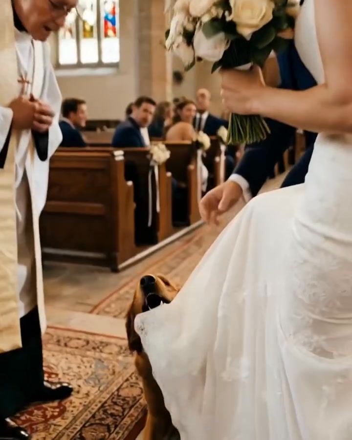 During the wedding, the dog grabbed the hem of the bride’s dress with its teeth …