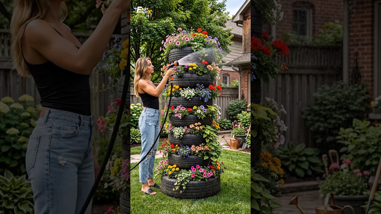 Watch this old tire tower turn into a stunning vertical flower planter for the backyard. A creative DIY garden project using stacked … source